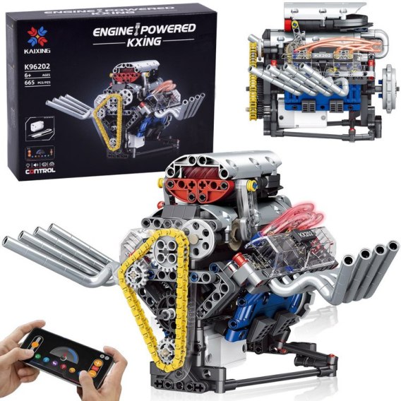 Interaktywne klocki techniczne, konstrukcyjne, mechaniczne, mechanik silnikowy, zbuduj silnik, funkcje świetlne i ruchome, pobierz aplikację