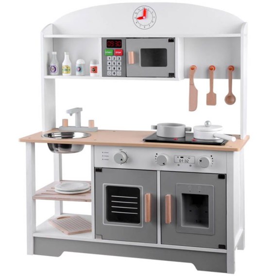 Kuchnia posiada szereg atrakcji; mikrofalówkę z podświetleniem, podświetlaną płytę indukcyjną z odgłosami gotowania, smażenia czy dystrybutor wody z funkcjami świetlnymi i dźwiękowymi, dzięki czemu zabawa staje się bardziej realistyczna. Drewniana kuchenka posiada również oświetlenie podszafkowe, które nie tylko ułatwia zabawę, ale także dodaje kuchni eleganckiego, nowoczesnego stylu.