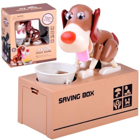 Wrzucamy monetę do miski pieska, która znajduje się przed nim, wówczas pod wpływem dotyku piesek zaczyna się ruszać tak jak by zjadał jedzonko z miski, co skutkuje iż moneta wpada do skarbonki. Piesek  w trakcie zjadania pieniążka śmiesznie się porusza i trzepie uszkami. Do uruchomienia skarbonki potrzebne są 3 baterie. Monety możemy swobodnie wyjąć przez otwór, który jest zasłonięty zaślepką.