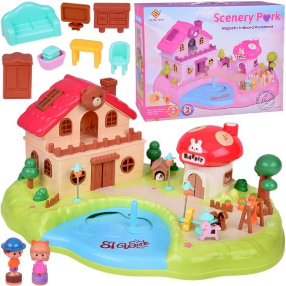 Zestaw przedstawia kolorową scenerię z uroczym, otwieranym domkiem, sklepikiem w kształcie grzyba oraz placem zabaw otoczonym drzewami, grządką z marchewką i innymi uroczymi szczegółami. Zabawka wyposażona została także w efekty dźwiękowe i świetlne, które zapewne urozmaicą zabawę.