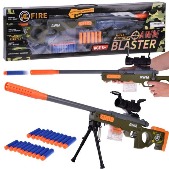 Duży karabin snajperski na naboje piankowe. Karabin wyposażony został w lunetę, wyciągany magazynek, naboje piankowe, które umieszczamy w tzw. łuskach. Po każdym przeładowaniu, z komory wypada łuska jak w prawdziwym karabinie, dzięki czemu zabawa staje się bardziej realistyczna. Celny strzał na odległość ułatwi luneta, która przybliży i zapewni przejrzysty obraz (można ją przybliżyć lub oddalić przesuwając pokrętło znajdujące się w górnej części lunety). Karabin nie wymaga żadnych baterii posiada naciąg mechaniczny, który zapewnia wygodne użytkowanie. Aby przeładować magazynek wystarczy pociągnąć uchwyt naciągu. W górnej części karabinu oraz na chwycie przednim umieszczono szyny, do których przymocować można niezbędne akcesoria: lunetę oraz dwójnóg. W magazynku mieszczą się cztery naboje piankowe umieszczone w łuskach. Magazynek możemy wyciągnąć za pomocą przycisku znajdującego się obok magazynku przesuwając go w jego stronę. Po wciśnięciu przycisku z przodu magazynku możemy odpiąć stację przeładunku zaś za pomocą przycisku z przodu karabinu możemy odpiąć lufę karabinu. Karabin został wykonany w całości z plastiku, dzięki czemu jest lekki.