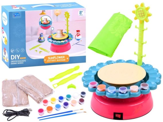 Zestaw zawiera: - koło garncarskie - glinę 270g 2 szt. - farby 12 kolorów - pędzelki do malowania 2 szt. - narzędzia do rzeźbienia 2szt. - fartuszek - miarkę - sznurek do odcinania z uchwytami - kabelek do ładowania z wejściem USB - instrukcję w języku angielskim