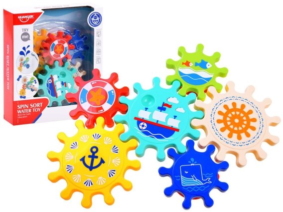 Kolorowe trybiki do przymocowania na płaskiej powierzchni, mają służyć do wesołej zabawy wprawiania ich w ruch za pomocą np. wody lub rączkami. Zestaw sześciu kolorowych trybików z grafiką i kolorystyką marynarską będą pasować do każdej łazienki, w której dziecko się kąpie. Zabawkę należy przymocować tak na ścianie, w kabinie prysznicowej, na ścianie wanny aby zębatki zachodziły za siebie. Wówczas dziecko ruszając jednym kółeczkiem wprawia w ruch całą konstrukcje.